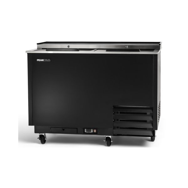 Serve beer in a frosted mug or glass using the PeakCold freezer and glass chiller! This glass froster is designed for frosty mugs, steins and chilled glasses. The steel exterior is coated with attractive wear resistant black vinyl with a stainless steel, easy glide lid. The condensing unit slides out for easy maintenance. This beer glass chiller features a controller with an automatic defrost cycle. This bar freezer is ETL listed and conforms to NSF std. 7.