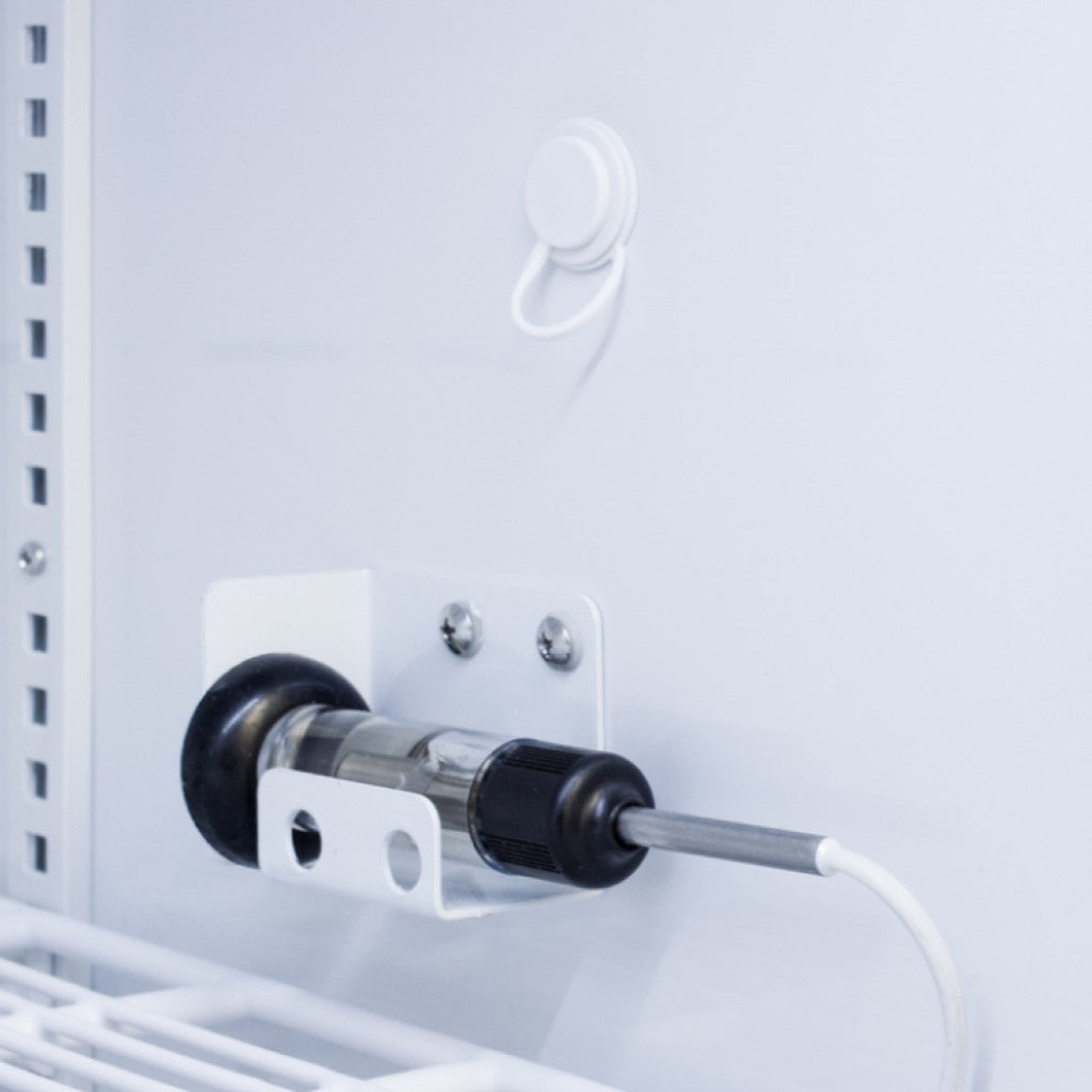 The ARG15PV is a 15 cu.ft. all-refrigerator with an adjustable control range from +2 to +8ºC. The microprocessor temperature controller is externally located to minimize door openings, helping to protect stored contents from ambient temperature. The buffered temperature probe is encased in a glycol-filled bottle to better simulate temperature of the stored product, with an additional sensor that reads air temperature to ensure superior temperature control. The current and min/max temperature display is viewable in Celsius or Fahrenheit to the nearest tenth of a degree. The audible and visual temperature alarm sounds if the unit's interior goes out of range. Additional alarms include a power failure alert, door open alarm, and sensor failure alarm. This unit is equipped with remote alarm contacts in the rear and a 1/2" probe port on the right side to accept additional monitoring devices. A hospital grade cord with 'green dot' plug is also included for added safety in high traffic areas.