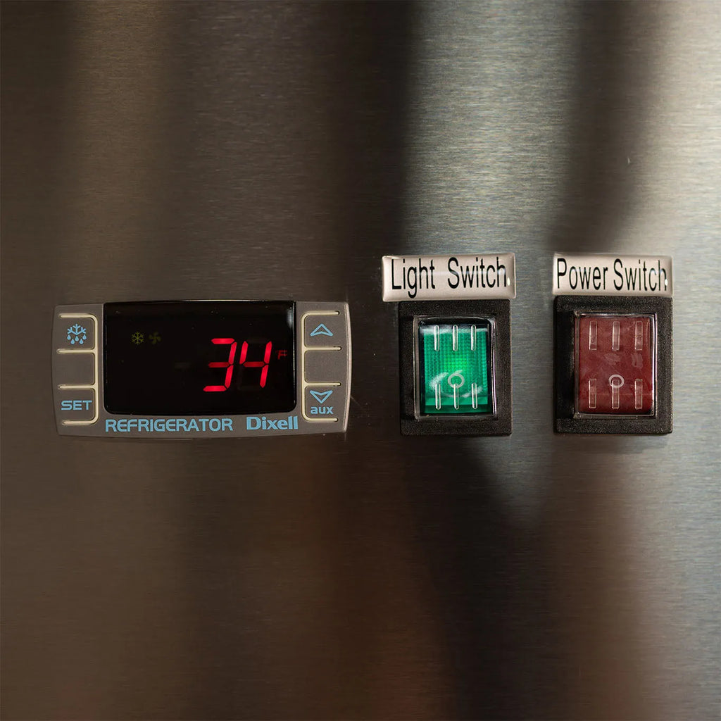 With three self-closing glass doors, heavy-duty shelving, and adjustable temperature controls, this 3 door cooler supports heavy commercial use while providing a clean, polished look. The 3-door stainless steel refrigerator finish adds durability and a professional style, making it a standout in busy kitchens and retail spaces alike.