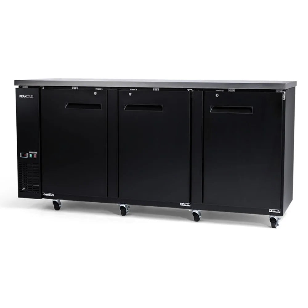 This PeakCold 3-door cooler is powered by a side mounted commercial compressor, allowing for a greater depth of storage in the cabinet. The exterior features wear resistant black vinyl over steel and a stainless steel counter height top. This 3 door beer cooler is ETL listed and conforms to NSF std. 7. The automatic defrost system, self evaporating water tray and standard 110v plug make it simple to use for home or business. A Dixell digital controller features adjustable temperature set point and defrost settings.