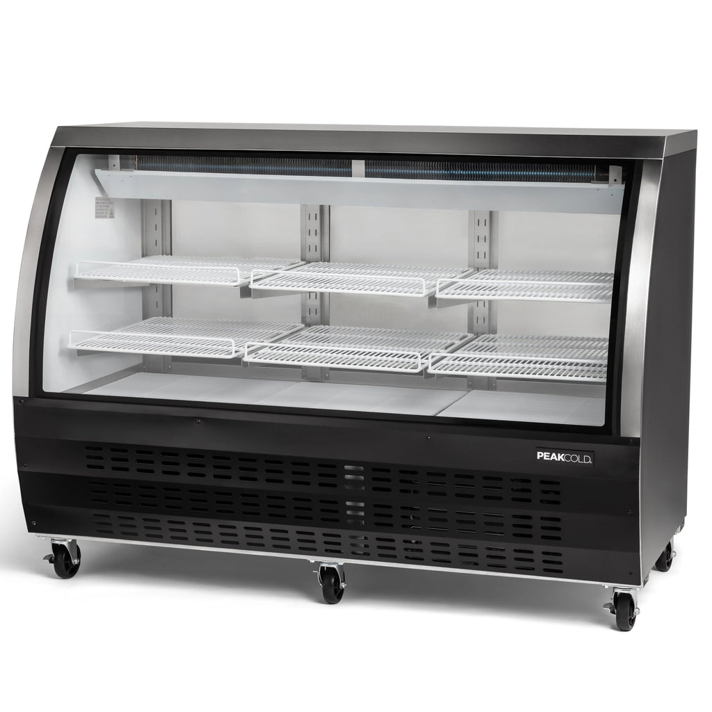 The PeakCold midsize refrigerated deli display case has a black exterior and aluminum interior with stainless steel floor. The curved glass showcase is powered by a 3/5 HP compressor. The deli counter has a digital control system with an adjustable temperature set point and defrost frequency. Error codes are displayed to diagnose service issues. Double pane curved glass showcases meat, seafood and other products on adjustable, heavy duty PVC coated display shelves with LED lighting. The condenser is easily accessible for service and cleaning and there is no plumbing required for installation.