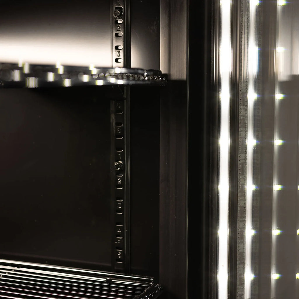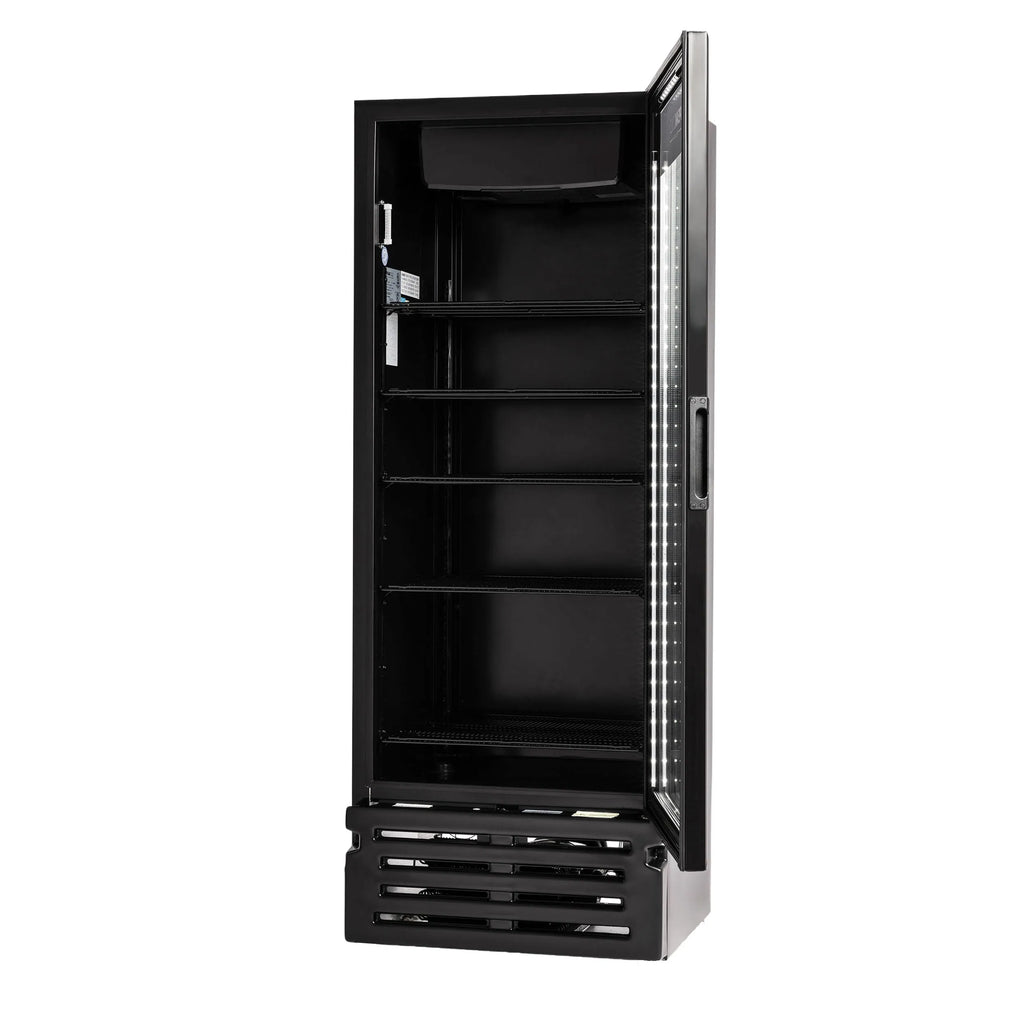 Our PeakCold Plus line features North American manufactured premium equipment. This upright display cooler features environmentally friendly hydrocarbon refrigerant and an electronic temperature controller for precision temperature adjustments. Users can adjust temperature settings quickly for optimal performance with the patented ETC1H dial controller. Ultra bright low energy LED lighting increases display impact while adding minimal energy cost. The low profile, door mounted LED lighting provides optimal product visibility for your customers. The black interior will make your products stand out! This PeakCold Plus premium display cooler also features electronic fan motors, an upgraded low-maintenance condenser and a low refrigerant charge for a highly efficient and reliable cooling system.