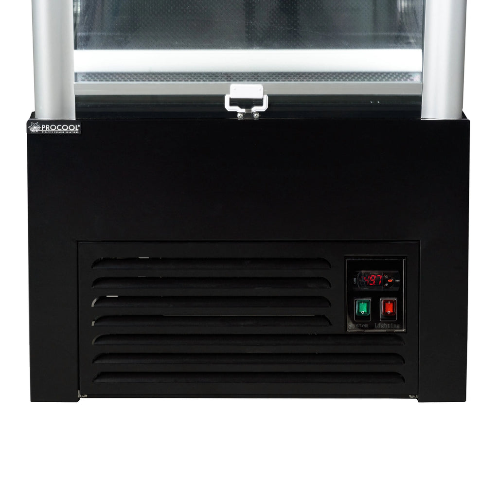 How does it stay cold without a door? The Procool air curtain cooler uses a high-velocity air curtain that flows across the opening and returns through the base to lock in the chill. A digital controller lets you set the temperature and program defrost frequency so performance stays consistent all day.