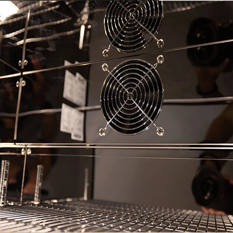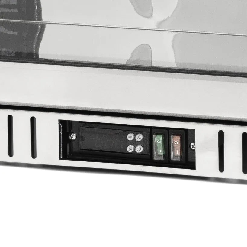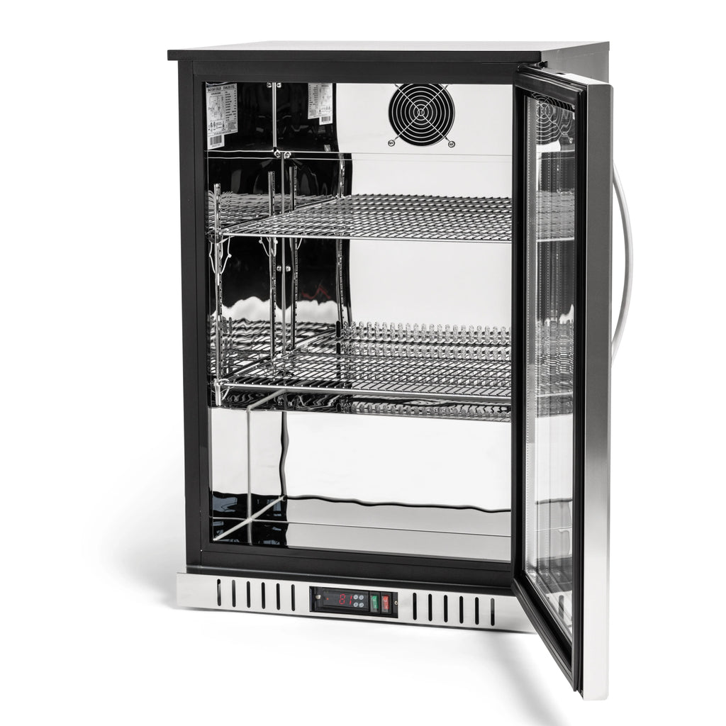 This Procool 24" residential back bar cooler features a stainless steel front and interior. An internal fan-assisted cooling system with a commercial grade compressor and separate cooling fan maintains an evenly distributed temperature. This single door glass front cooler has a digital controller that includes a defrost timer & LED display. This cooler comes with a lock and key, 2 front leveling feet, self-evaporating water tray, chromium plated metal shelves, interior LED lighting and a double-glazed self closing door with tempered glass.