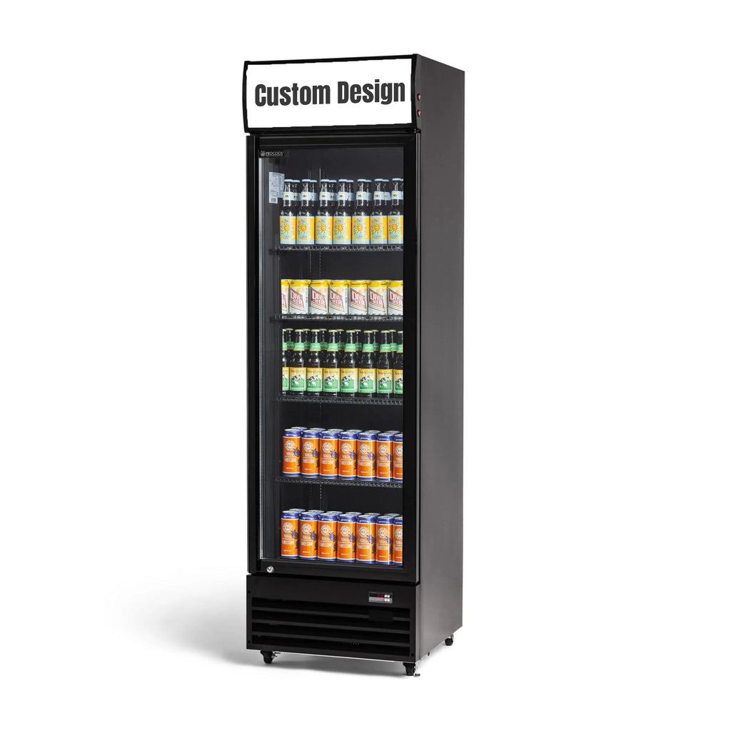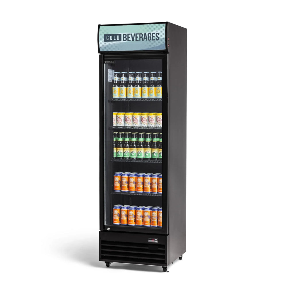This Procool single door black beverage cooler features a commercial grade compressor for high performance. The dynamic cooling system provides fast and even cooling. The digital controller adjusts temperature and defrost settings. The LED display shows current temperature and system information. The automatic defrost system drains condensation into a self evaporating water tray that does not need to be emptied. Vertical LED interior lights completely illuminate the products on display. The coated wire shelves are adjustable to fit products of various sizes and additional shelves are also available for purchase. The glass door is lockable and self closing. The outer tempered glass provides an additional safety measure. This display cooler can be used to display canned or packaged products in key locations in your business. The universal design fits into any setting easily.
