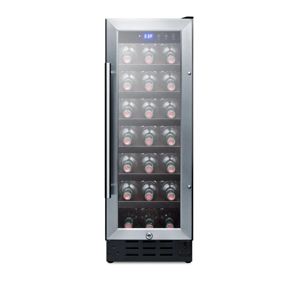 At just 12" wide, SUMMIT SWC1224B features a front-breathing design for built-in installation under counters, but also has a fully finished cabinet for alternate freestanding use. The interior can store up to 21 standard Bordeaux style or wider Burgundy style bottles. The reversible glass door features stainless steel trim and a professional handle, with a factory installed lock to prevent unsupervised access.