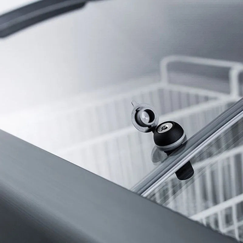 Features two smoothly sliding tempered glass lids. The angled top offers increased visibility to help maximize impulse sales. This unit includes a removable keyed lock to allow users the option of securing their goods. The white cabinet suits any setting, while the gray lid trim offers an added touch of clean style. We include a set of sturdy commercial casters for users to install if they prefer the freezer more mobile. The digital thermostat is externally located for easy temperature management, with a wide range from -13 to 23 ºF to accommodate a variety of desserts. We pre-set the unit to -4 ºF.